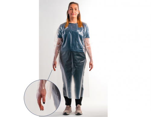 Förklädet är försett med en perforering i nacken vilket gör att hålet för huvudet kan anpassas i storlek samtidigt som det underlättar när förklädet skall tas av. Ärmarna har ett tumhål för att förhindra att förklädet hasar upp när man sätter på handskarna.